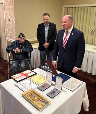 In November 2023, a West Seneca resident, Paul Wisniewski, contacted the West Seneca Joint Veterans Committee to see if he could get his father’s (Edward L. Wisniewski) medals from World War II replaced. Over the years, the medals originally presented to Edward Wisniewski were lost or misplaced. The Veterans Committee contacted Walt Koch, Deputy District Director, 26th Congressional District of NY and sought his help to obtain replacement medals.