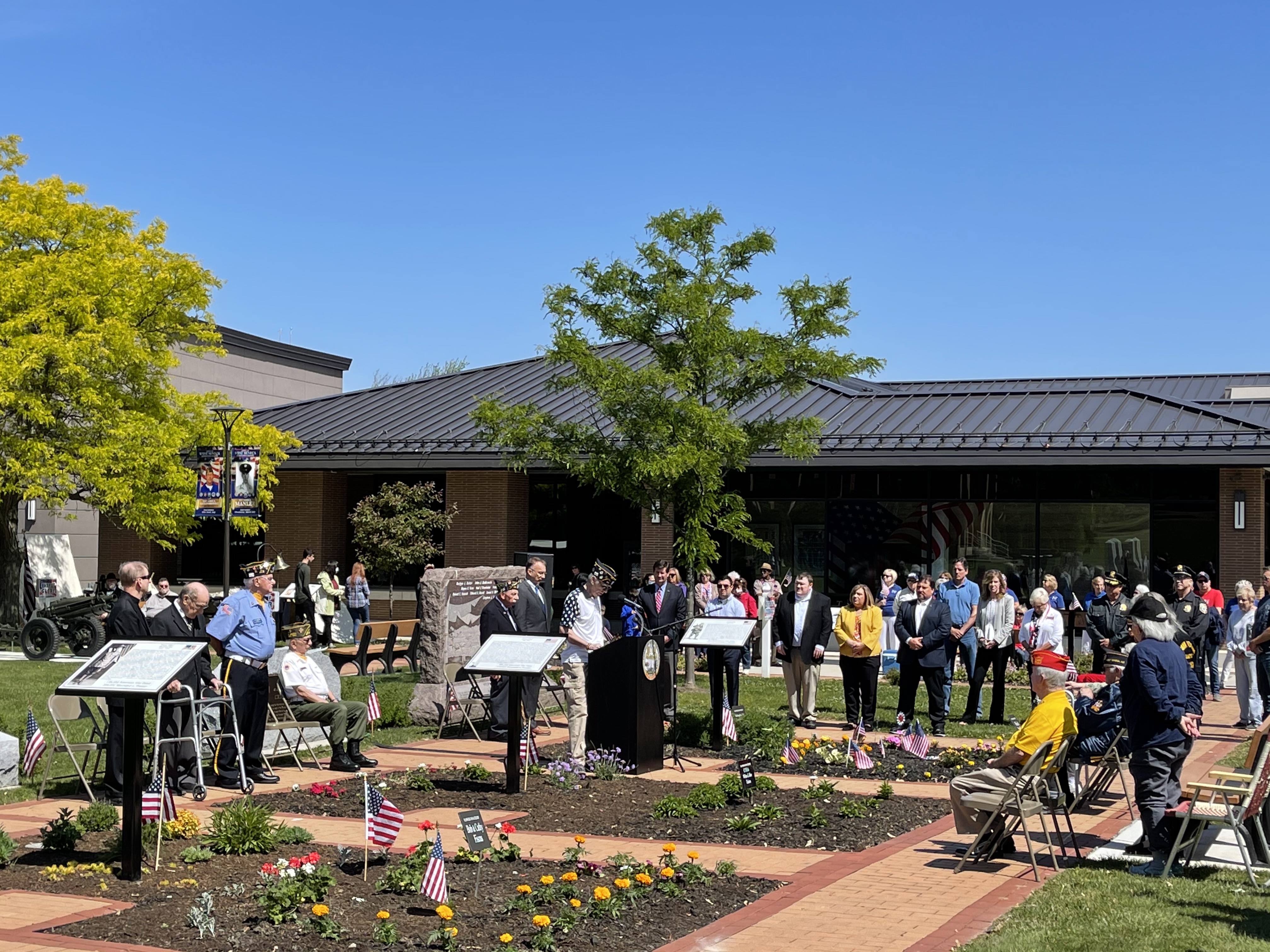 in front of the West Seneca Library, was moved into storage in 2016 to make room for the new Community Center and Library. The Korean monument, created in 2018, was also placed into storage until the Walkway was redesigned to accomodate all the monuments.