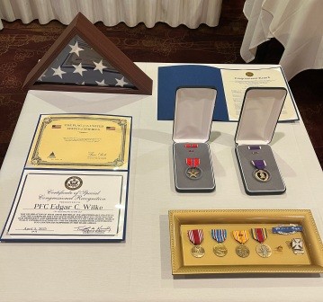 Congressman Kennedy also presented Private First–Class Edgar Carl Wilke with the military medals that he earned while serving in the Army. The medals included the Bronze Star Medal, Purple Heart, Good Conduct Medal, American Campaign Medal, Asiatic–Pacific Campaign Medal (with two bronze service stars), World War II Victory Medal, Combat Infantryman Badge 1st Award, Honorable Service Lapel Button WWII, and the Marksman Badge with Rifle Bar.