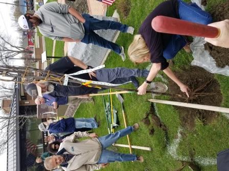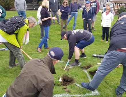 Volunteers prepare the ground for planting | |  Master Gardener Linda Garwol explains the tree root system |