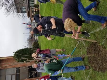 Stakes are pounded in to support tree | |  Seminar attendees pose with newly planted tree |