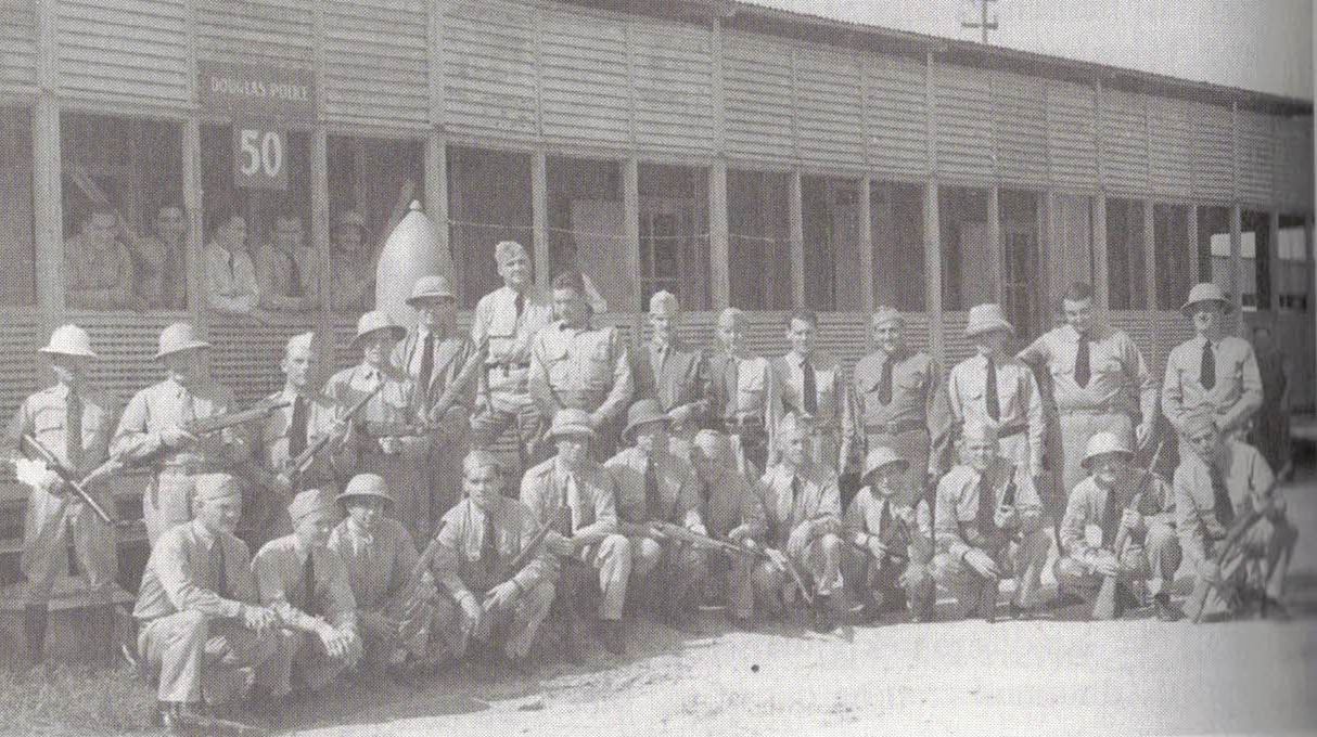 The base where the Project 19 civilians were quartered and worked had no protection from German forces, African natives or wild animals. They had no American troops to defend them and were largely ignored by the English. A token group of English soldiers were sent to the camp but they did not actively attempt to protect the Project 19 workers. The Americans were left to create their own police force to protect their camp. Volunteers formed the American Volunteer Guard (AVG) under the direction of the Army. The volunteers of the Guard were issued uniforms, guns and refurbished Italian rifles. The AVG held drills, attended security meetings and trained on various weapons. Although the AVG performed routine armed guard duty around the airfield, they were never called upon to defend the camp against an outside threat.